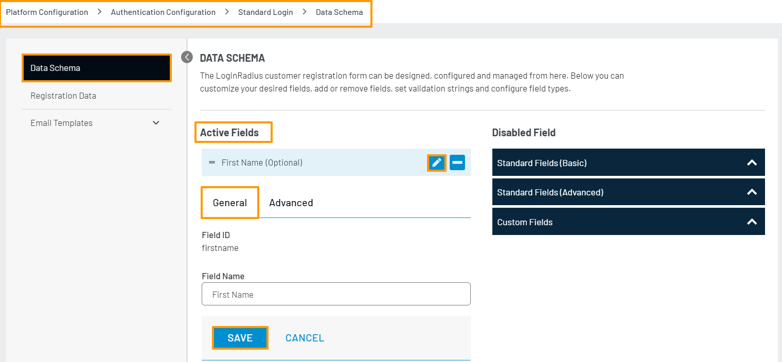 This document highlights the fields provided by LoginRadius for user registration forms. We have categorized the fields in 3 categories i.e, Standard Fields (Basics), Standard Fields (Advanced) and Custom Fields. You can configure and manage the fields for registration forms under the LoginRadius Admin Console > Platform Configuration > Authentication Configuration > Standard Login > Data Schema.